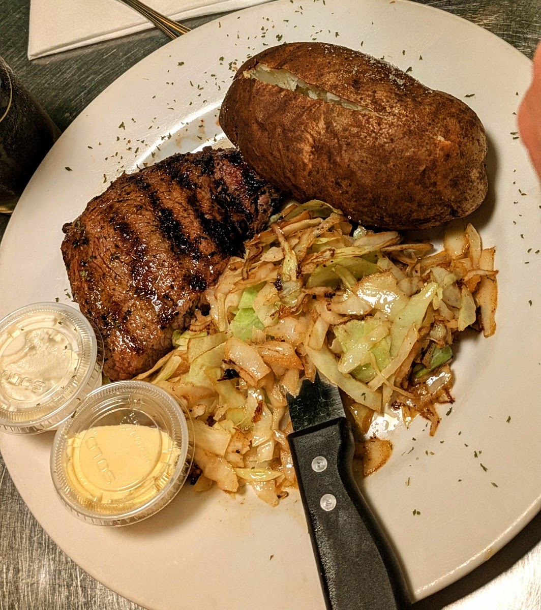 My steak was great! Best one I've had out to eat in a long time! Everything was good. Only dock was the salad toppings were sparse and the fried pickles needed to be drained before putting in the basket. The bottom layer was drenched in oil. Other than that, great waitress, fresh food, with good seasoning. Very happy!