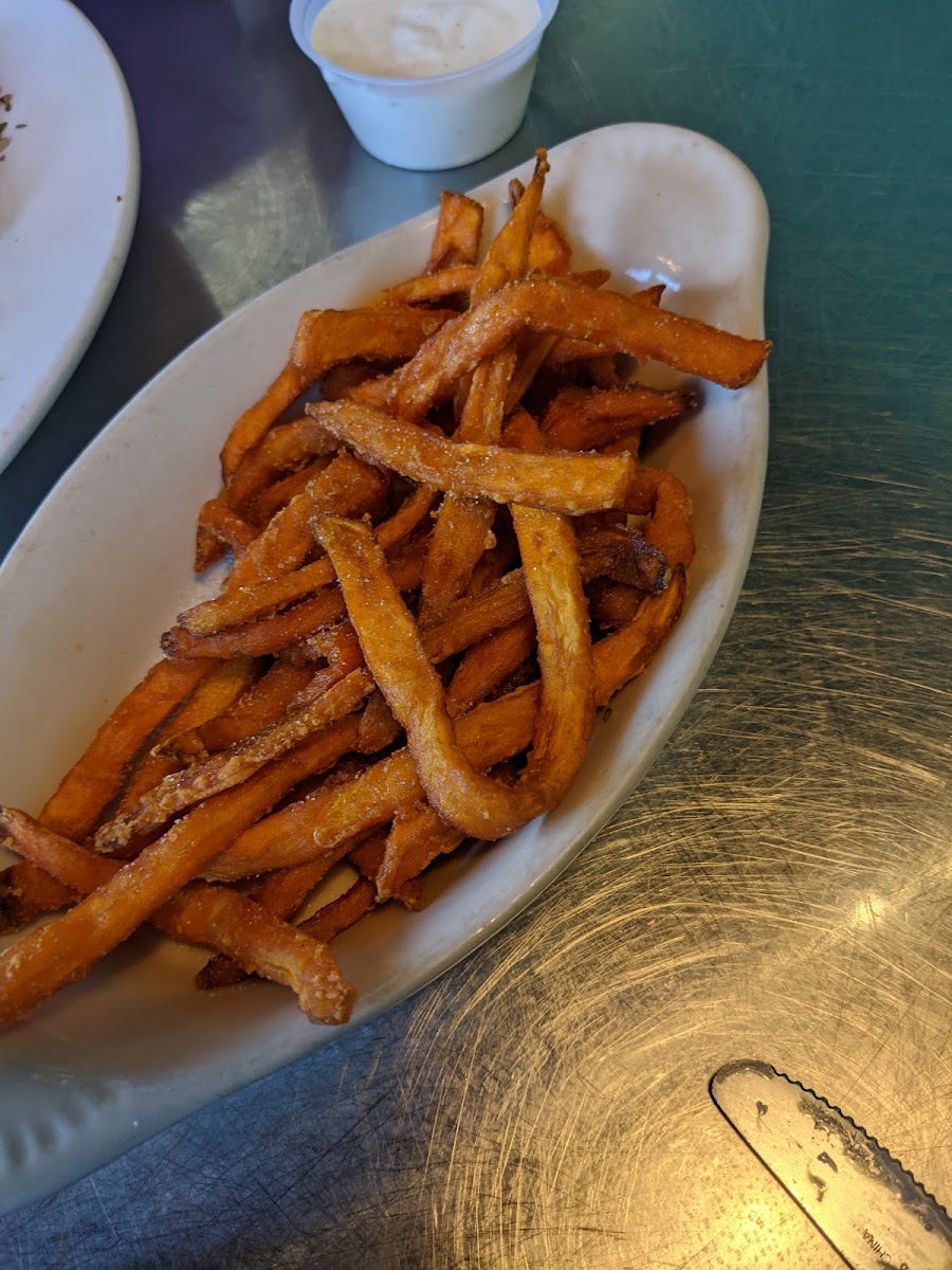 Nice local place. Good menu, had a few differentthings. I tried the Reuben w/sweet potato fries - did not disappoint. The corn beef was shaved and grilled first - delicious. (Thanks to Peyton's suggestion, I'll try the chicken salad next time) Hubby had a great, big cheeseburger w/sweet potato fries too, they were crispy, had a hint of brown sugar, good. They fried green tomatoes were pretty darn good, crunchy yet the tomato wasn't too soft. Half and half tea was spot on. Great server Peyton! Sure hope I remembered your name correctly